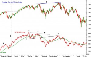 By early September the A/D line was again in an uptrend (higher highs and higher lows) On October 11th, 2007 SPY hit a high of $157.52 but the A/D line was much lower (point 4). The A/D line had just rallied back to its downtrend, line b, and the former support, now resistance at line c.