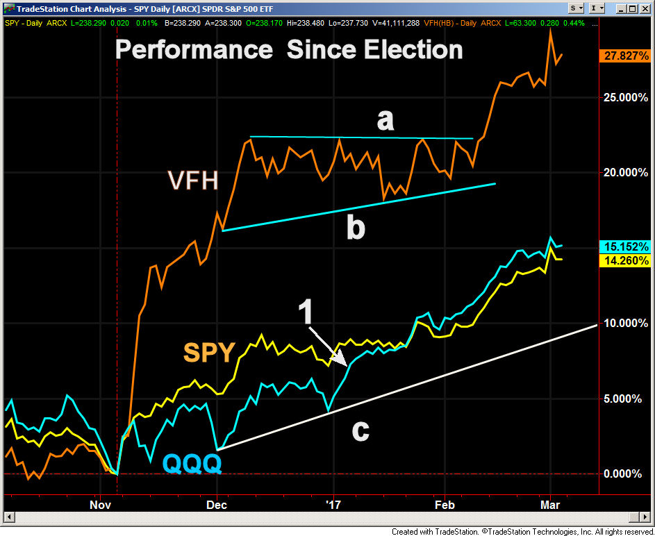 This percentage change chart shows the performance of the Vanguard Financial ETF (VFH, Spyder Trust (SPY) and the PowerShares QQQ Trust (QQQ) since the election. Viper ETF investors went long in late October and sold on December 6th for over a 16% profit as I felt the risk was too high. This was two days before the December high.