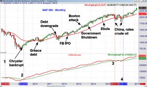 By March of 2016 the monthly A/D line had moved back above its WMA (line 4) which confirmed the bullish action of the weekly A/D lines in February (Is There Blood In The Streets Yet?) By the end of May the A/D line had made new all time highs which I pointed out then was a major bullish signal for stocks.
