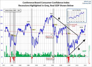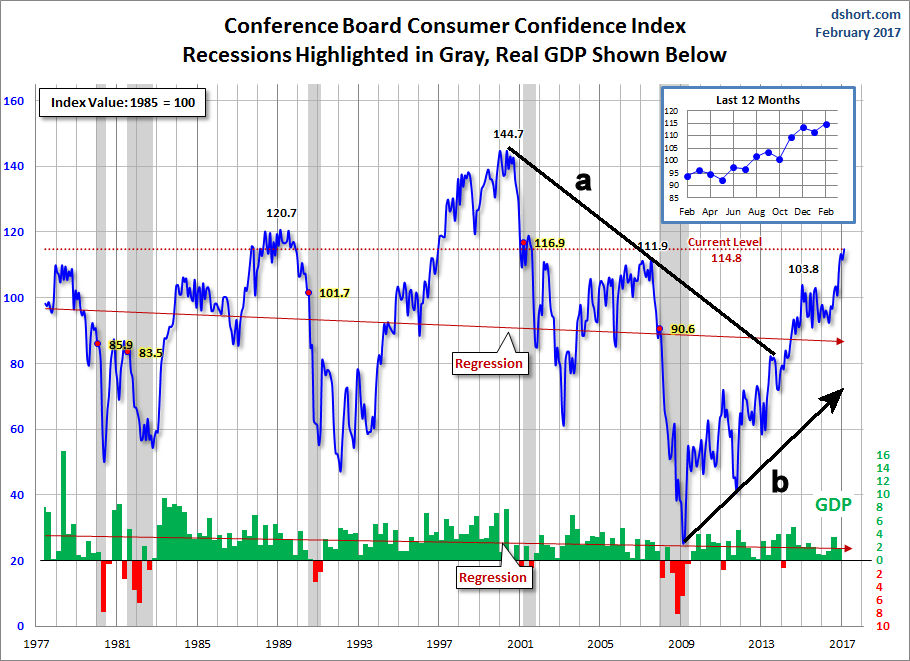 Tuesday's February Consumer Confidence at 114.8 was the highest reading since 2001. I have added the annotation to Doug Short's excellent chart which shows the break of the downtrend, line a, in 2014. I discussed this positive development at the time as it confirmed the strong uptrend, line b. It indicates a positive economic outlook for the months ahead.