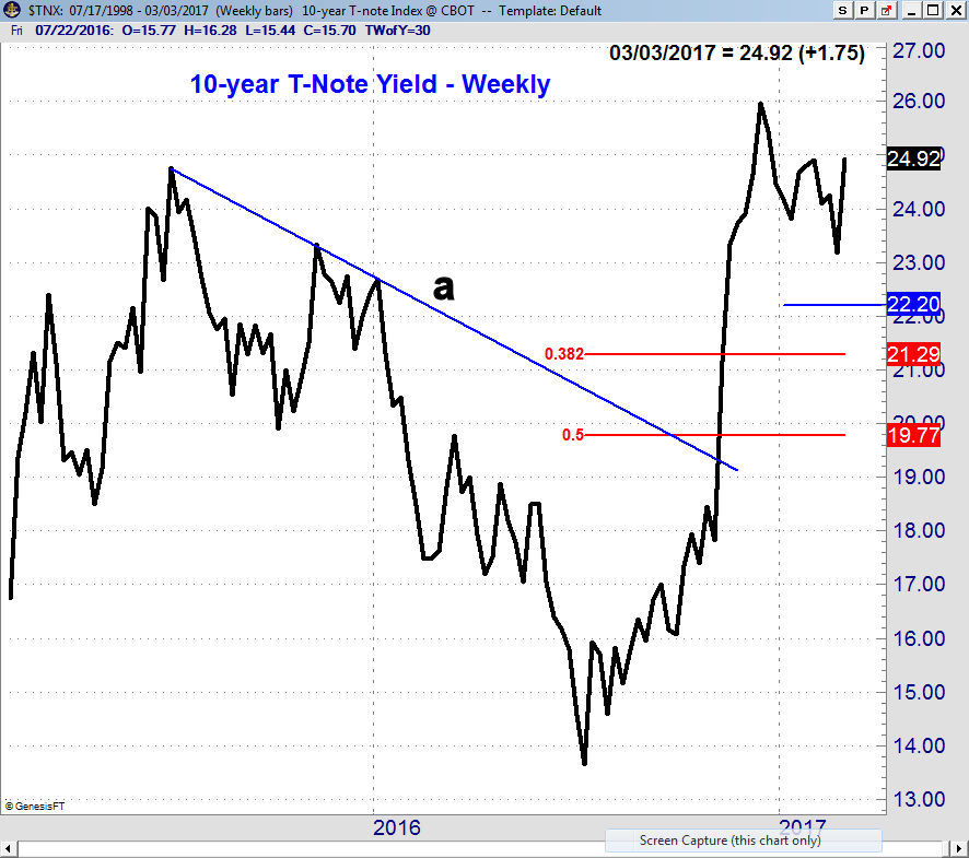 The yield on the 10-year T-Note reversed sharply last week as it closed at 2.492% up from 2.317% the previous week. The weekly close only chart suggests that the pullback in yields from the December highs is now over. A daily close in yields above 2.540% would be further confirmation and yields peaked in December at 2.596%.