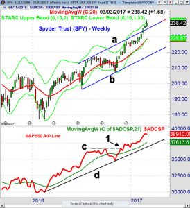 The chart also reveals that QQQ broke out to new highs in early January, point 1, after forming a solid uptrend (line c). This confirmed the bullish action of the Nasdaq 100 A/D line in December that indicated a positive weekly and daily trend as well as the leadership of QQQ. It has been leading the SPY since early January.