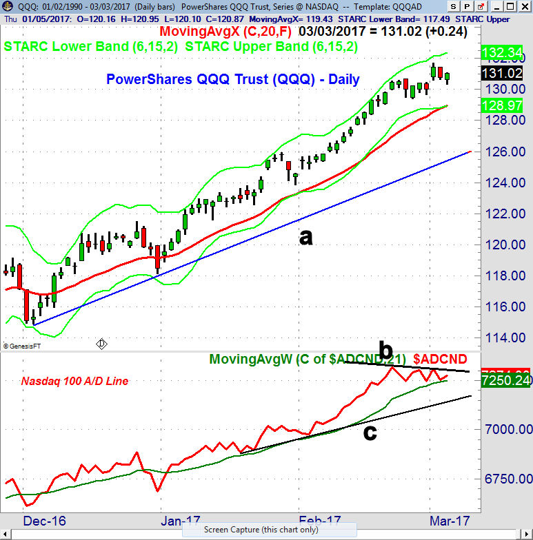 The Nasdaq 100 A/D line peaked on February 21st and has since formed slightly lower highs, line b. It has turned up from its WMA but could drop below it with negative A/D numbers early in this week. The A/D line support is well below current levels at line c.