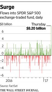 Last Wednesday $8.2 billion flowed into the Spyder Trust (SPY) which was the highest since 2016. As the arrow indicates the outflows at the end of the year were quite heavy as investors moved out at the wrong time. It has been my view since November that even though the new administration may not be able to actualize their lofting goals the major change in bullish sentiment is likely to last well into 2017.
