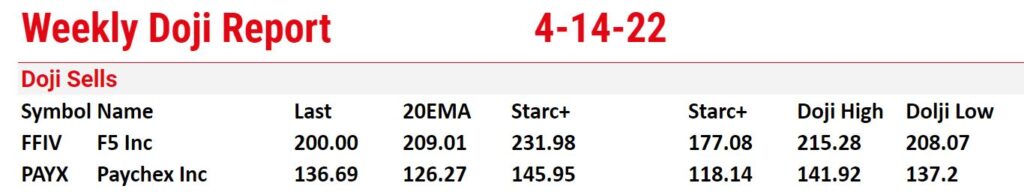 Also sent out over the weekend will be the selected stocks with weekly doji sell or doji buy signals. For more on this technique, check out one of my more popular video lessons on YouTube. Subscribers will also receive a written trading lesson with more in-depth instructions.